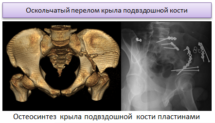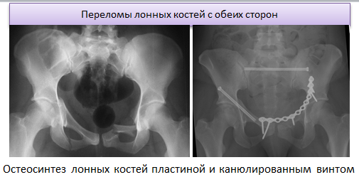 Вид и продолжительность стабилизации таза зависят от локализации повреждения, наличия или отсутствием нарушения целостности тазового кольца. При изолированных и краевых переломах как правило лечение консервативное. Проведение оперативного лечения переломов костей таза показано в случае повреждения костей заднего полукольца таза, значительном расхождении лонных костей при разрыве симфиза, неэффективности консервативного восстановления положения отломков при их значительном смещении.