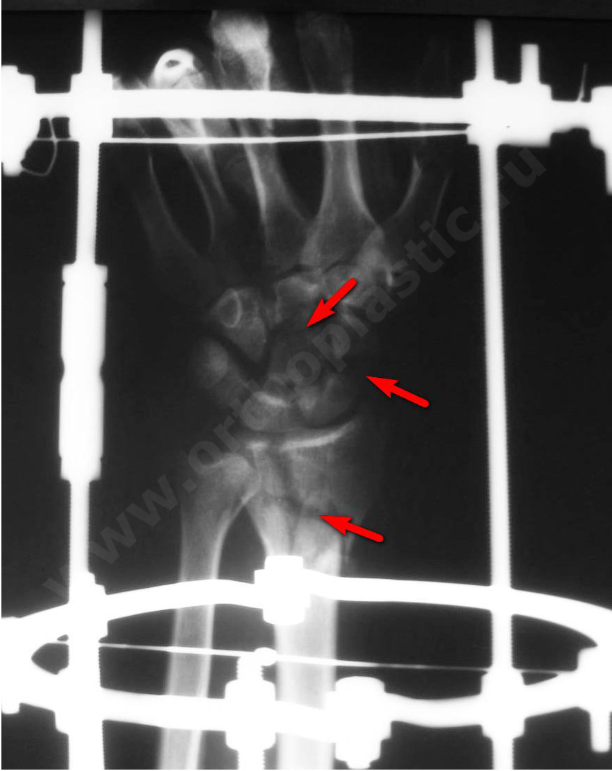 Несращение является наиболее частым осложнением переломов ладьевидной кости, особенно в случае неправильного лечения или когда повреждение осталось незамеченным. Для лечения несращений ладьевидной кости в нашей клинике применяется наиболее современная методика: остеосинтез компрессирующим винтом в сочетании с пластикой васкуляризированным костным лоскутом. Сочетание механической стабиллизации и улучшение кровоснабжения области повреждения с помощью кровоснабжаемого костного лоскута позволяет восстановить анатомию ладьевидной кости и добиться консолидации в самых сложных случаях.
