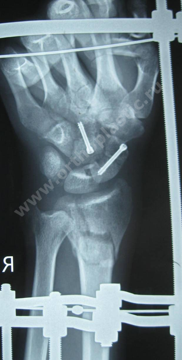 2- рентгеграмма пациента К. после открытой репоцизии, остесинтеза костей запястья компрессирующими винтами