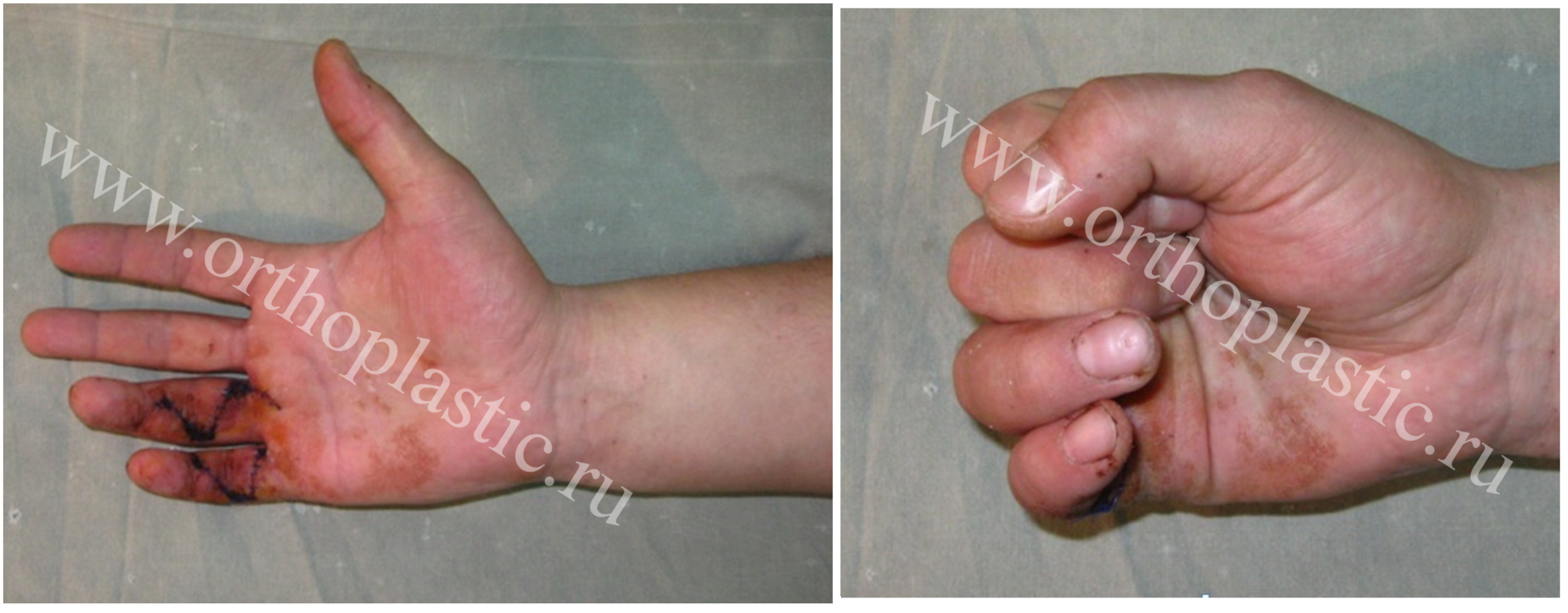 Пациент разрабатывает движения 4,5 пальцев правой кисти через 3 суток после шва сухожилий сгибателей.